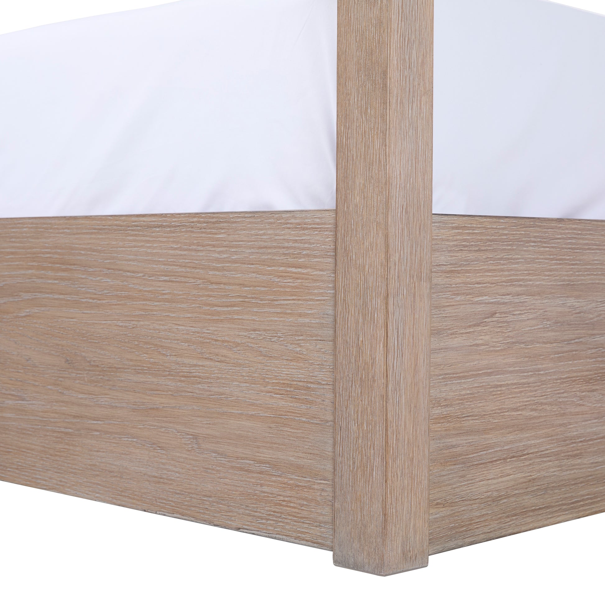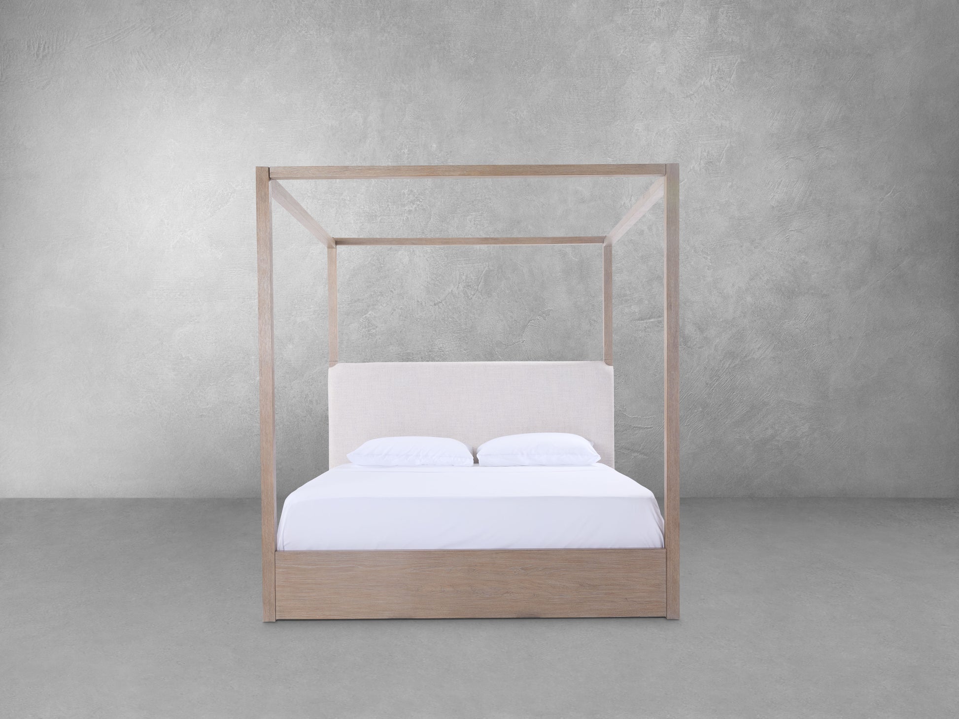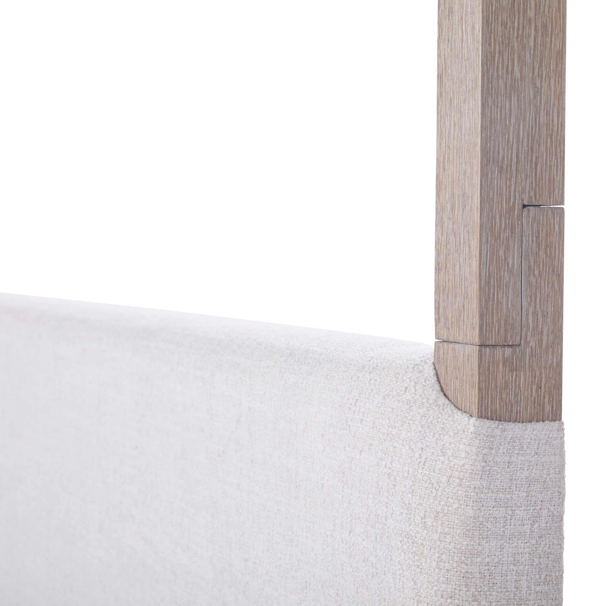 The Bronte Canopy Bed brings a modern, natural serenity to the bedroom with its sculptural silhouette and softly layered materials. Crafted from solid rubberwood and oak veneer, the frame is finished in a multi-toned light brown that highlights the organic grain with depth and warmth. An upholstered headboard in textured performance polyester adds a quiet softness against the structured canopy form — creating a striking yet tranquil focal point. Airy, grounded, and effortlessly elevated, Bronte feels like a retreat made for slow mornings and intentional living.