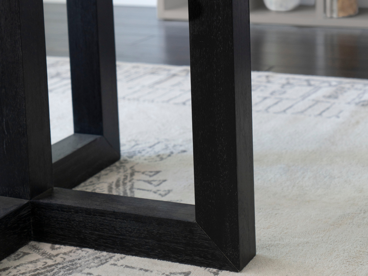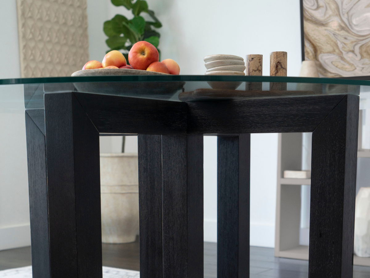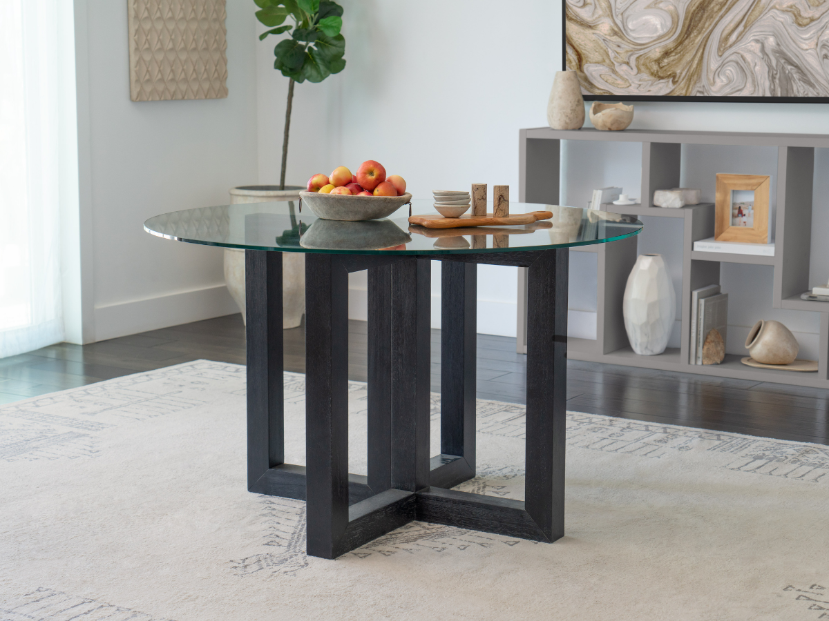 This Atlas glass top dining table with wood base in black is sure to enhance the look of your dining room. The durable tempered glass top is supported by a sturdy wood base, designed for stability and long-term use. Its modern style is perfect for any contemporary home.