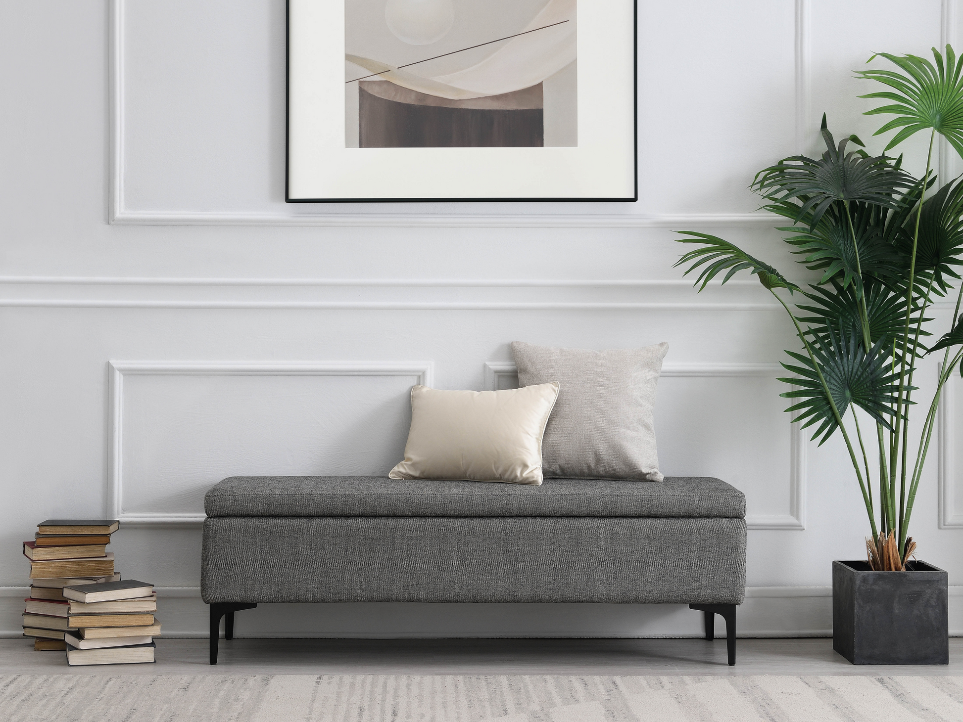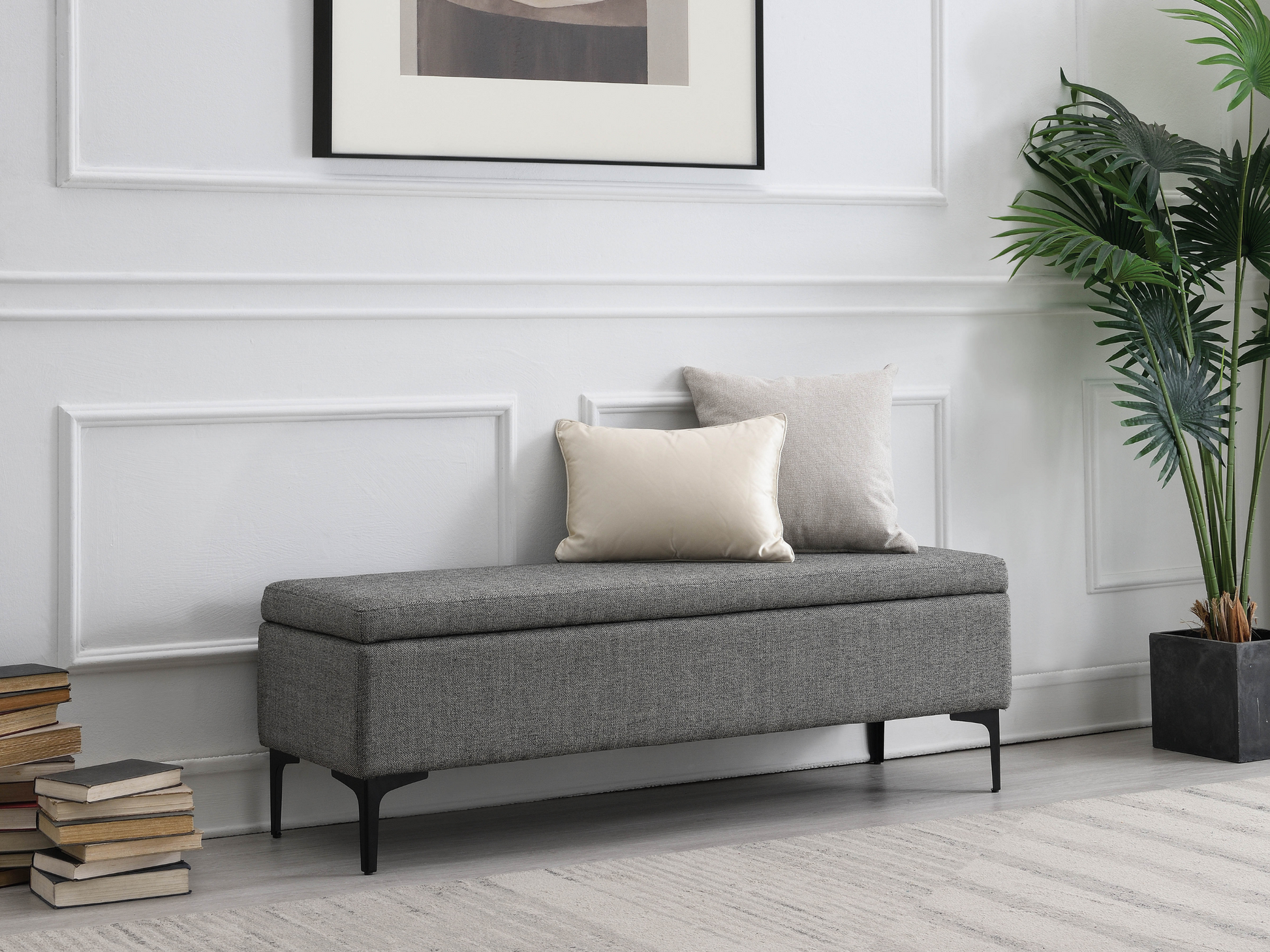 Includes One (1) Storage Bench The kiln-dried hardwood frame is to help prevent against warping. High resiliency 1.8-density foam for everlasting support and comfort. 100% polyester fabric Assembly Required