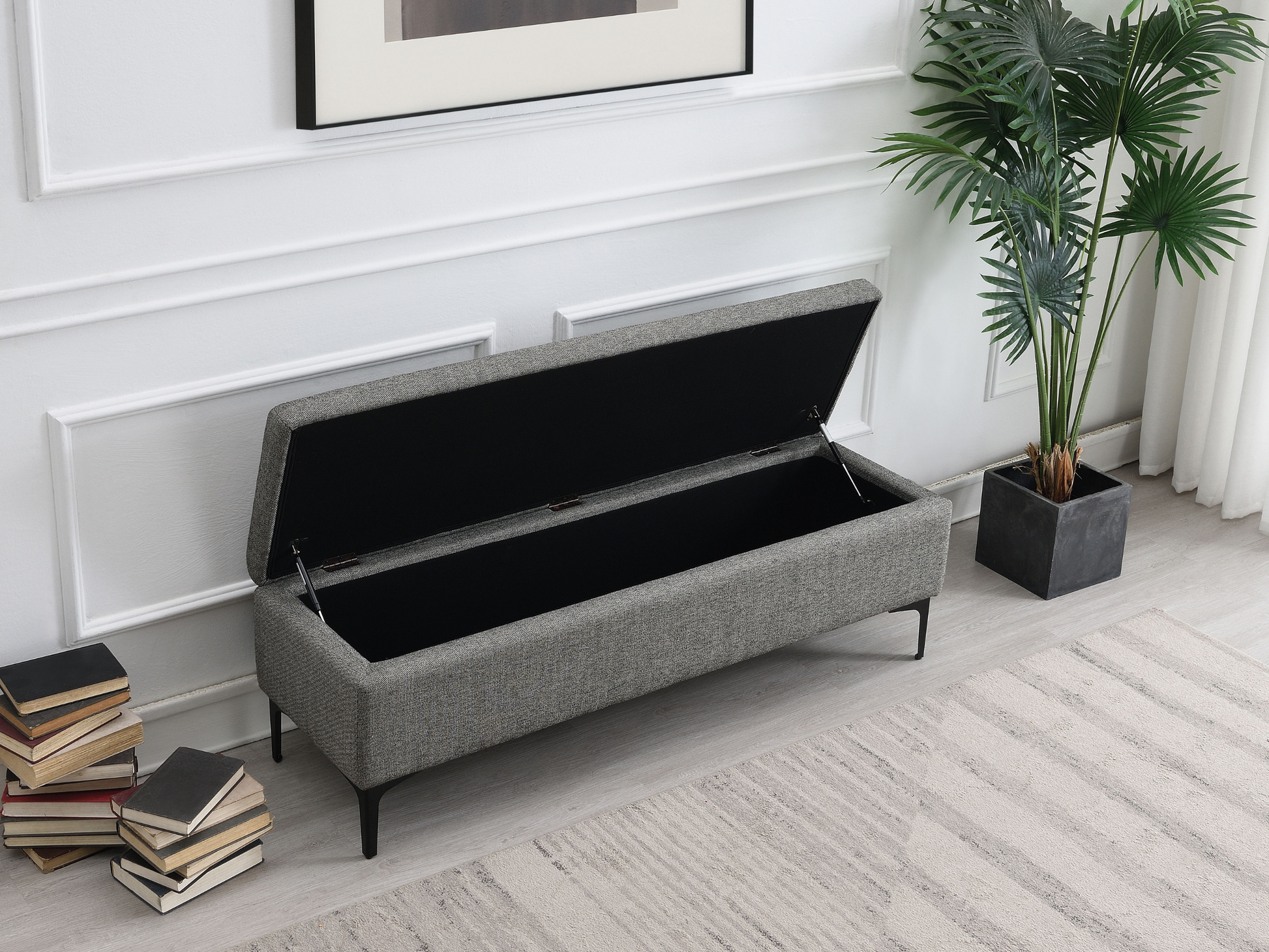 Discover a stylish way to organize your bedroom with the Evella Upholstered Storage Bench. Boasting a luxurious polyester upholstery with highlights and lowlights, its unique twill pattern offers multi-dimensional texture and durability. Highlighted by its stately black metal legs, this bench brings convenience and sophistication to your living space.