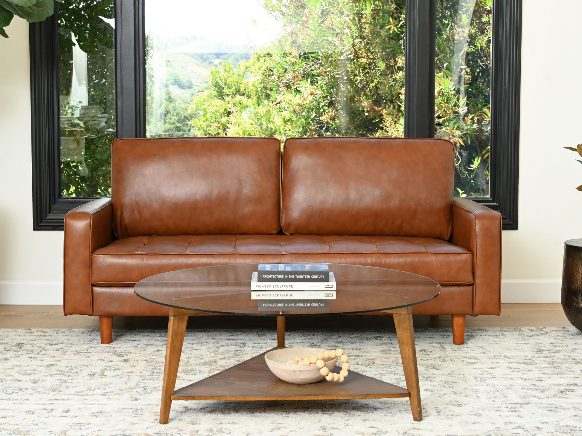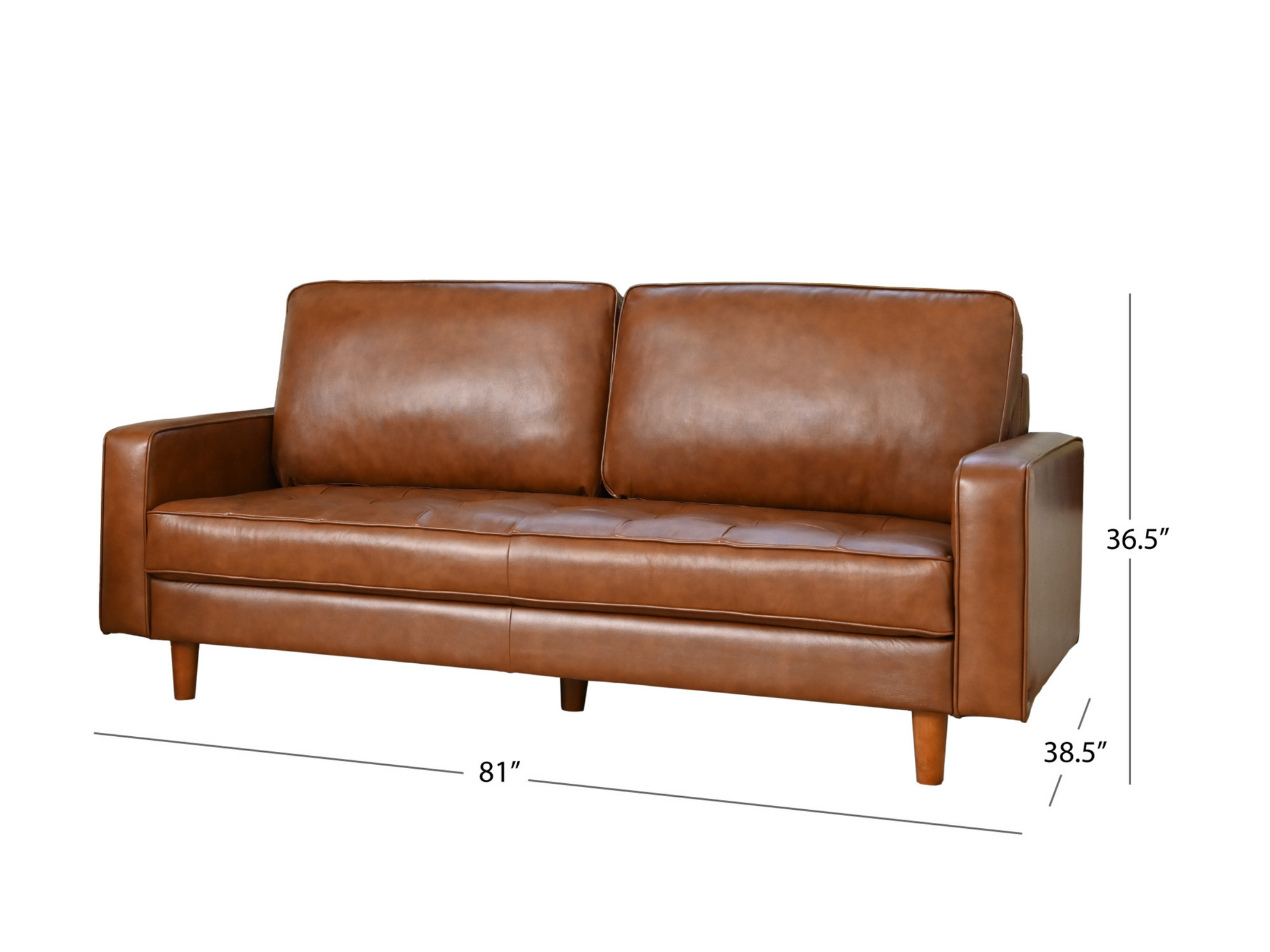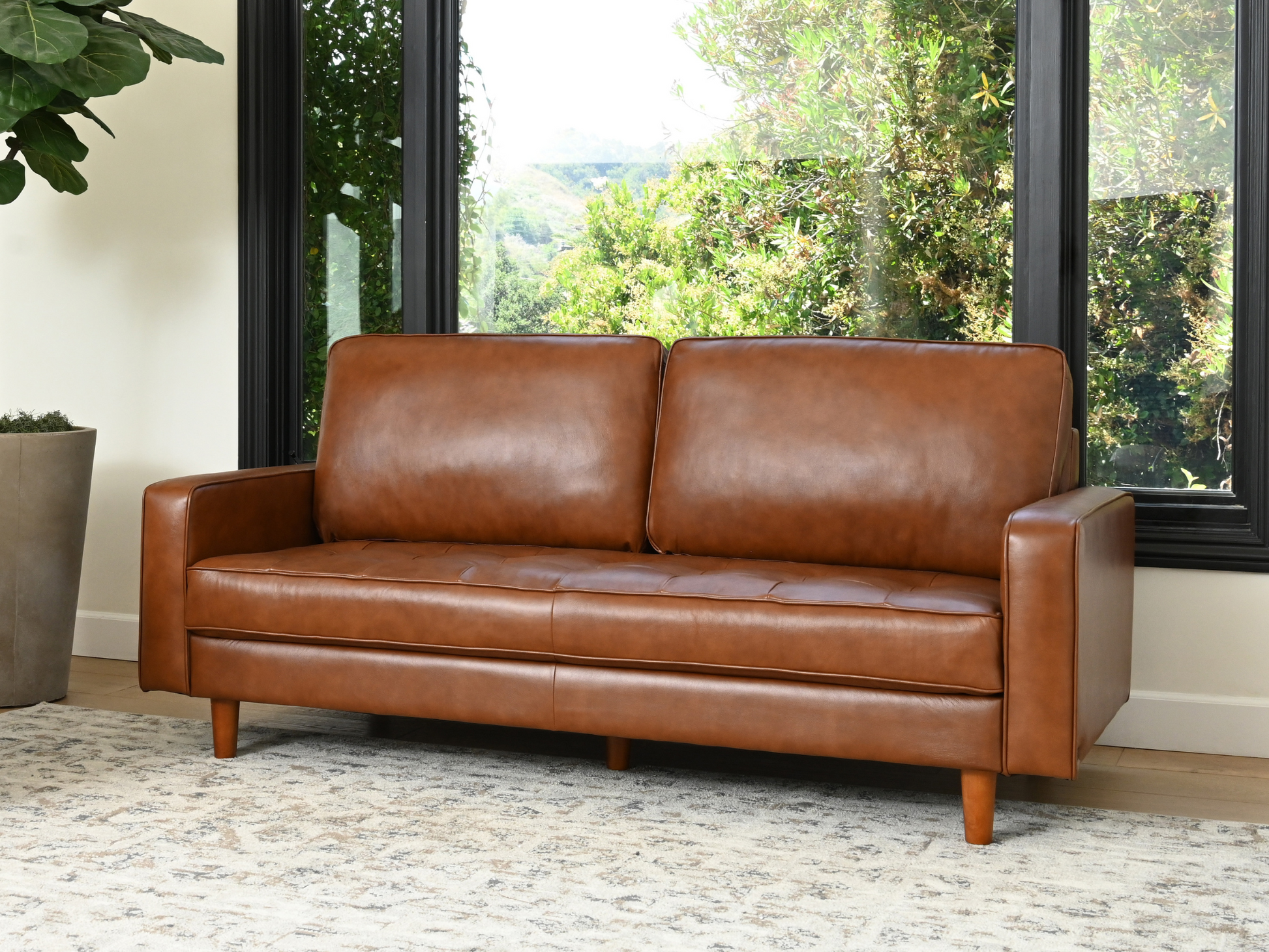 Capture modern mid-century style with Abbyson's Holloway Leather Sofa. The Holloway features a rich camel 100% Top Grain Leather on all seating areas with high-quality leather match on side panels and back. With high-density button tufted foam seats, detachable back cushions and a solid wood frame you'll be sure to have support, comfort and style for many years to come.