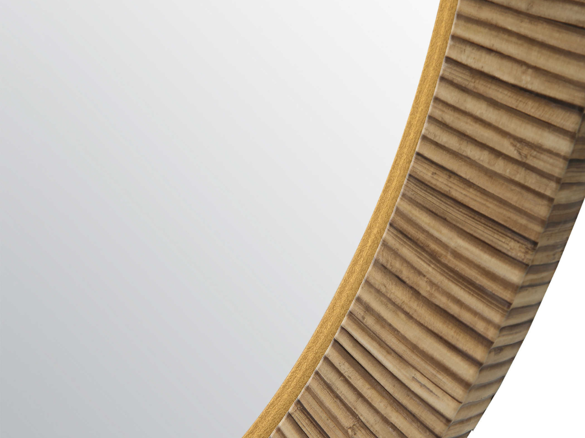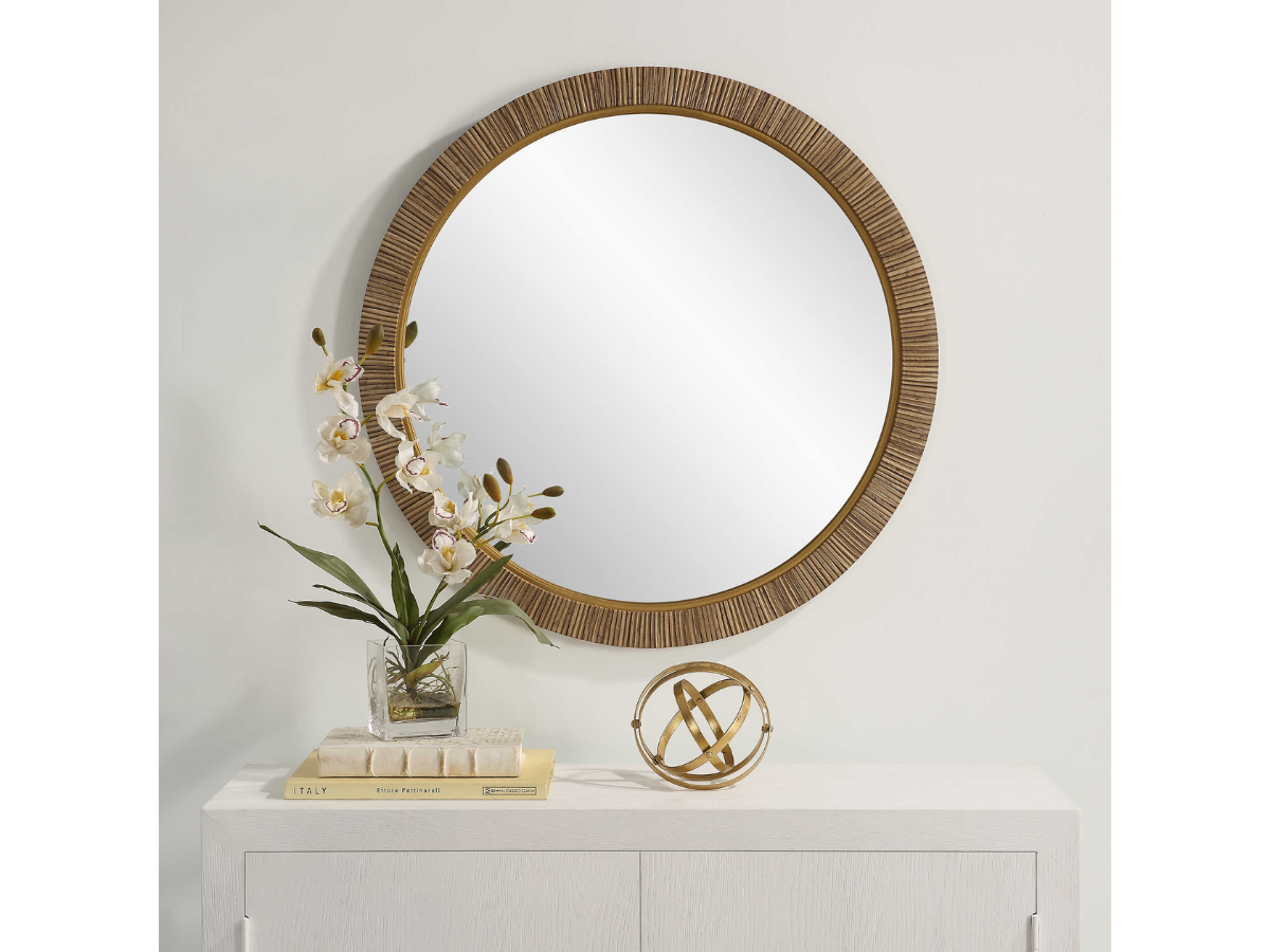 This beautiful 30" round mirror will put the finishing touch on your coastal decor. Designed to resemble real rattan, this frame is constructed with an authentic looking wrap that gives the look of real rattan, without the worries of moisture. A complementing gold liner surrounds the mirror. Enjoy the warmth and texture of this welcoming and relaxing design anywhere in the home.