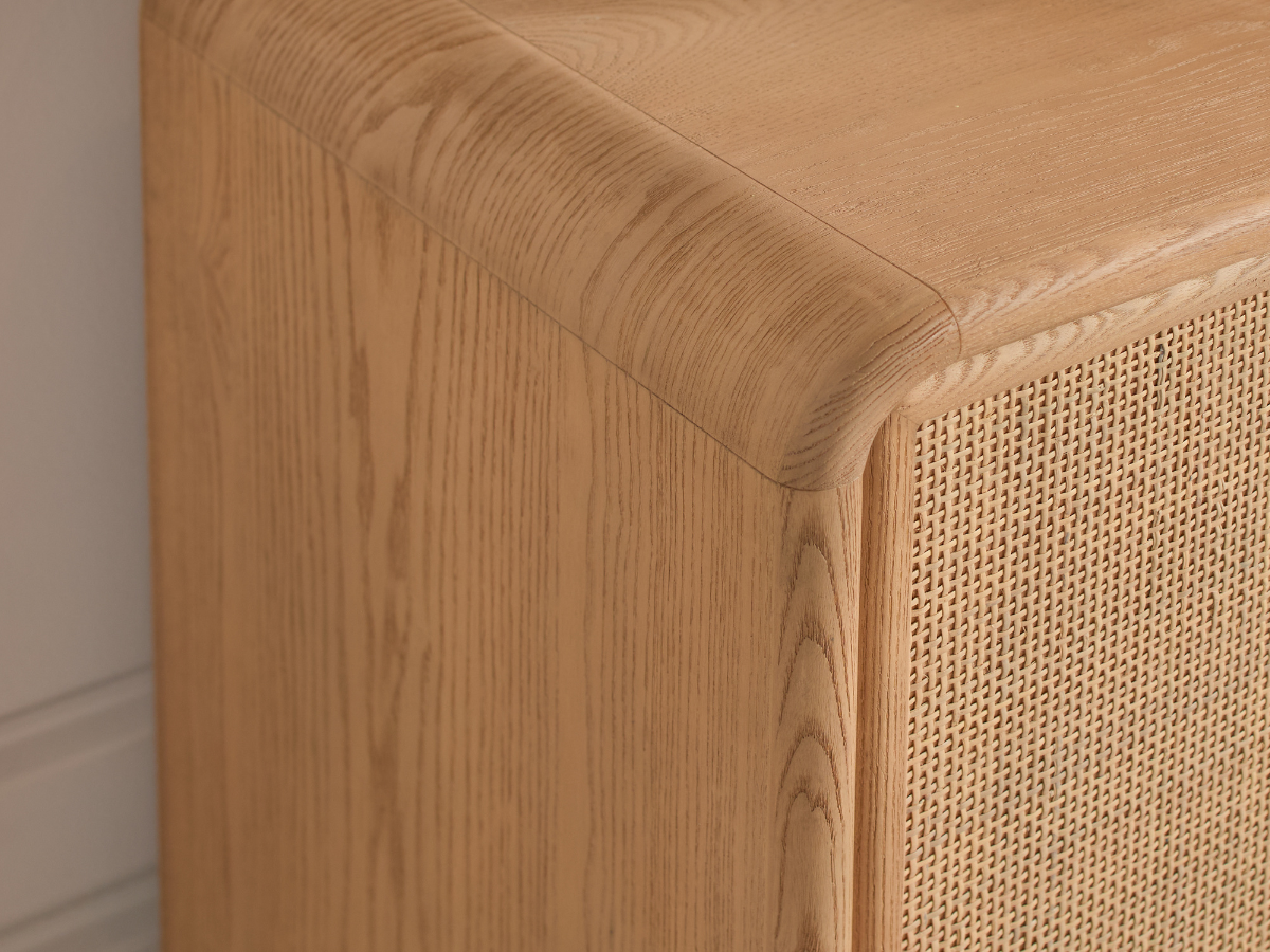 The Pauline Collection pairs rounded edges with rattan cane details for a look that is timeless and romantic. Constructed of solid ash wood with ash, Okoume, and beech veneers, Pauline’s features two cabinets with shelving to store loose items with wire management to keep you organized. Available in black or blonde, Pauline’s natural finish celebrates her solid wood construction.