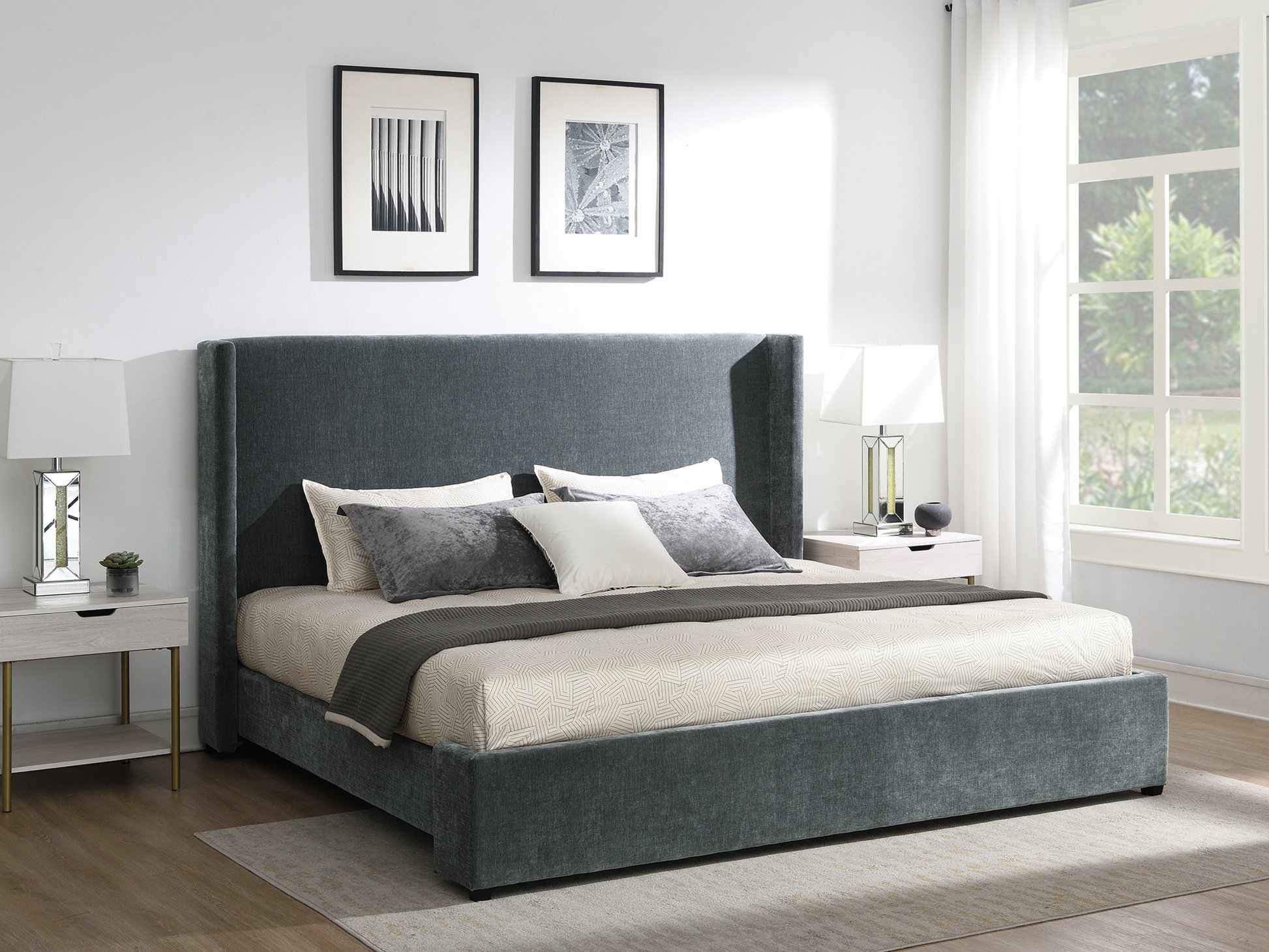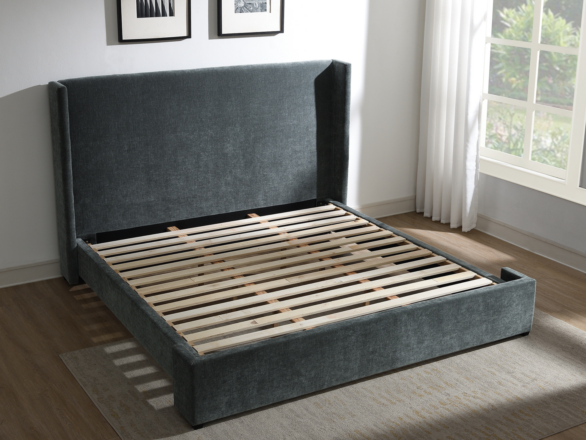 Includes One (1) Headboard, Two (2) Siderails and Slats, and One (1) Footboard. Solid Loblolly Pine + Plywood frame, 100% Polyester Fabric Wrapped in a beautiful fabric, giving a clean and comfy look to any bedroom 1.8 Density foam surrounding frame and headboard Easy knock-down assembly