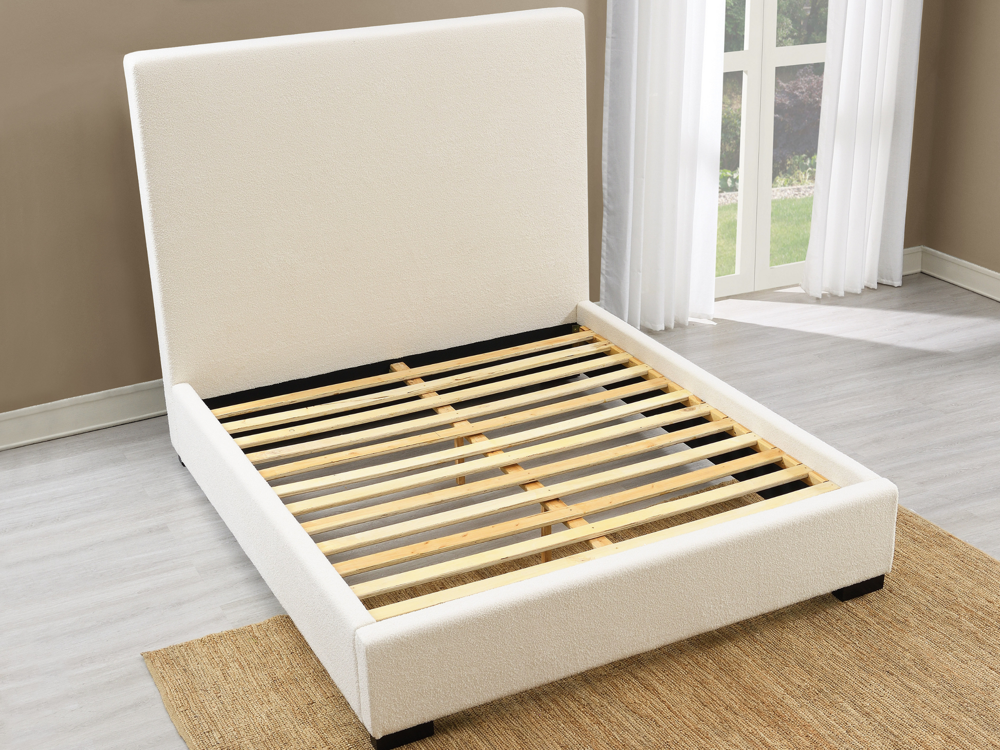 Includes Side Rails, (1) Footboard, (1) Headboard. Material: Solid Hardwood with Plywood Frame, Plywood slats with Larch wood construction,1.8 density foam, rubber wood leg 2.5inch high The boucle fabric is a fun, shearling type fabric with looped, lustrous yarn that gives this fabric a dynamic look. The soft texture of the yarn gives a unique, three-dimensional feel to the fabric. Comes with 12 slats for outstanding support and comfort. Assembly Required.