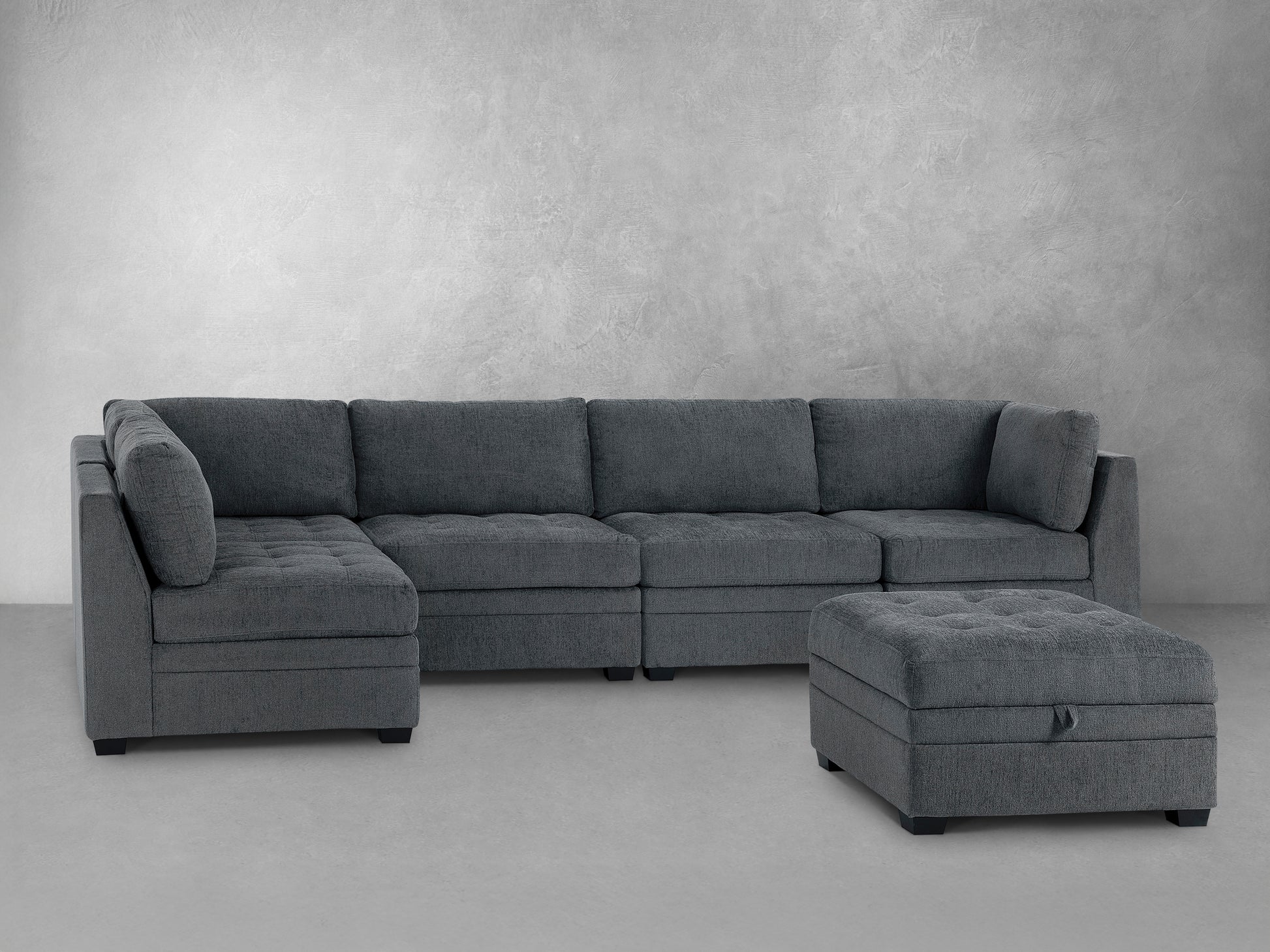 Includes One (1) Storage Ottoman, Three (3) Armless Chairs, and Two (2) Corner Chairs Materials: Asian hardwood, foam, polyester Modular style for endless size options and designs Kiln-dried hardwood frame to help prevent against warping High resiliency 2.0-density foam and pocket coils for everlasting support and comfort Tufted seat cushions Corner blocked joinery Care & Use: Vacuum on a weekly basis to avoid dust particles from settling into fabric grains. Wipe fabric with a soft cloth and warm water. Do not use chemicals. Avoid placing your furniture in direct sunlight. All materials fade over time when placed in direct sunlight Assembly Required