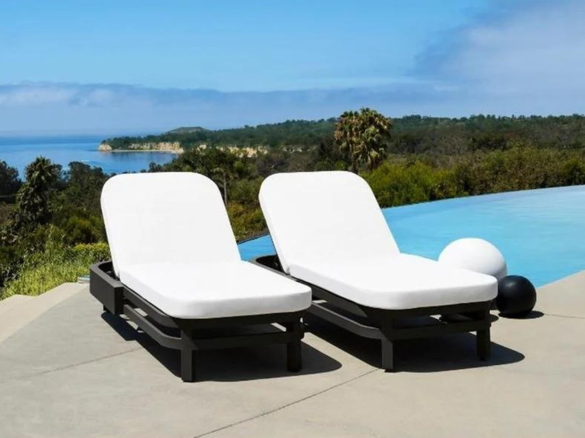 Includes: Two (2) chaise lounges Upholstery Materials: Sunbrella Upholstery Fill: High density foam cushioning Upholstery Color: White Style: Coastal, modern Outdoor cushions upholstered in Canvas White Sunbrella coverings Engineered with generous back support for maximum comfort Strong and lightweight powder coated aluminum frame High density foam cushions for outdoor use Lightweight components can be moved to fit perfectly in your outdoor space Assembly Required