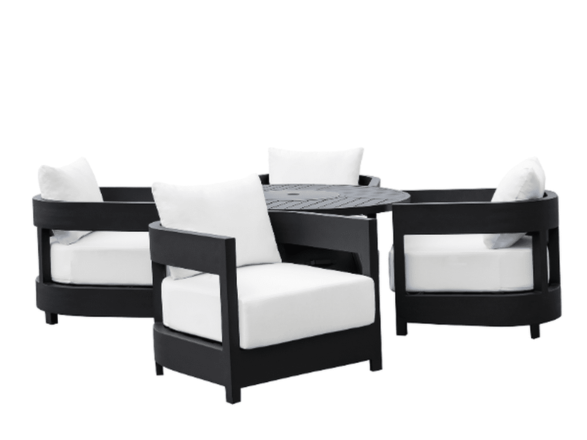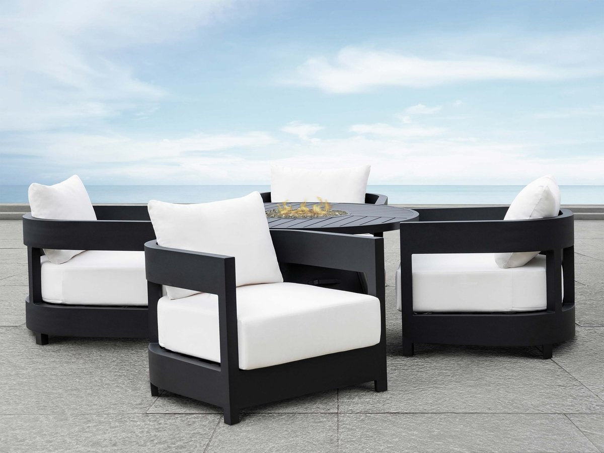 Create an elegant retreat in your outdoor space with the Santino® Fire Chat Set. Spacious and made with comfort in mind, the Santino® Collection is the perfect addition to your outdoor space. Santino® offers durable quality with eye-catching style, featuring Sunbrella wrapped cushions and powder coated aluminum frames. The set includes one (1) fire table and four (4) armchairs that you can enjoy all year round.