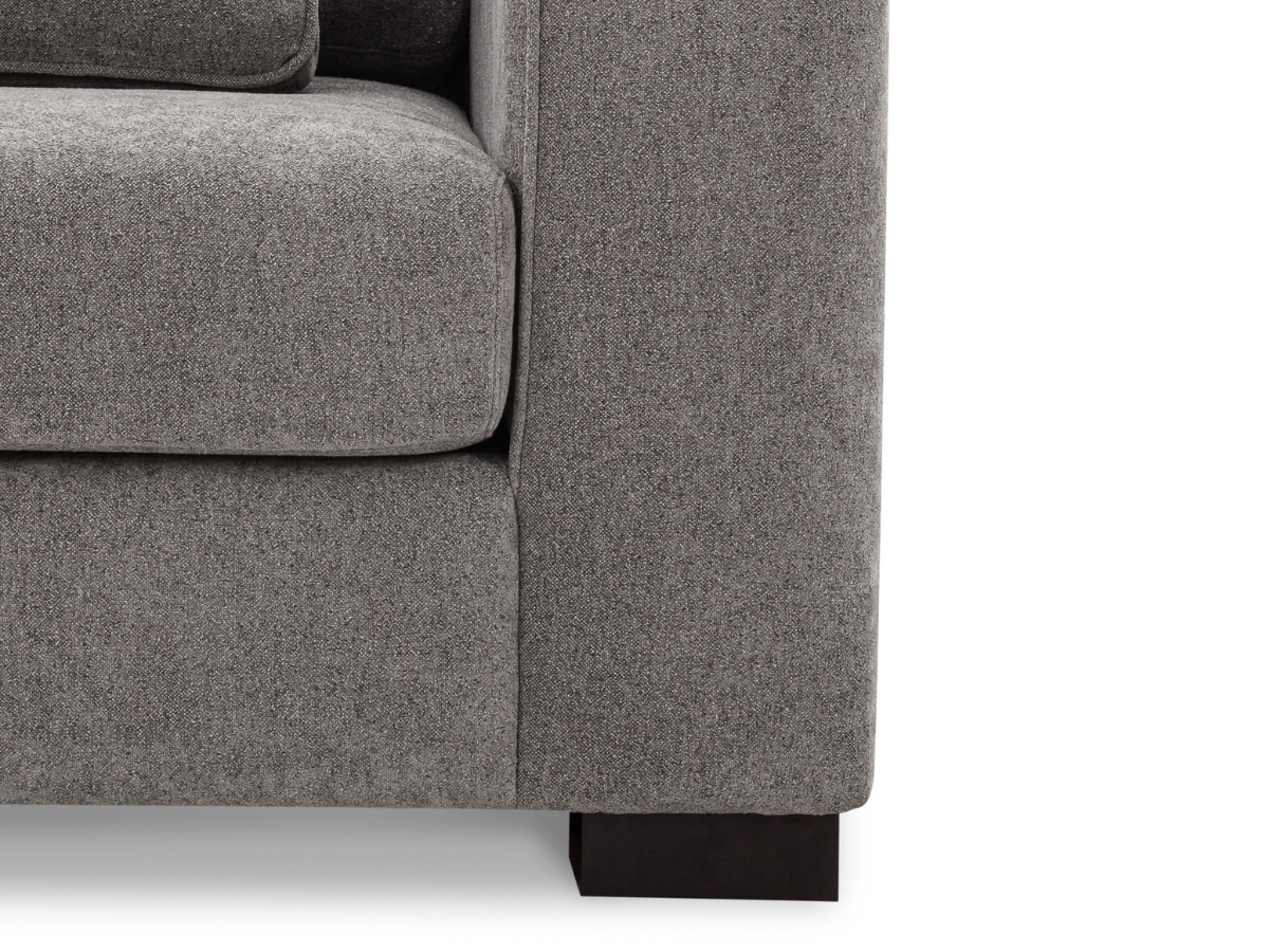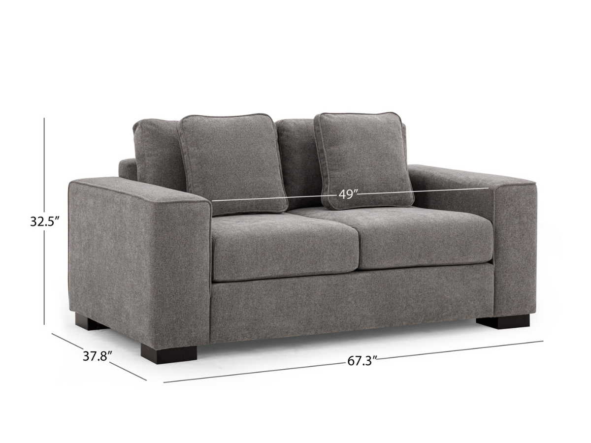 Includes: One (1) loveseat, two (2) accent pillows Upholstery Materials: Polyester Upholstery Color: Light Gray or Charcoal Style: Modern 2.2 High Density foam seat cushions Seat Comfort: Firm but comfortable Sinuous wire spring construction Elastic webbing suspension system for even weight distribution in the frame Kiln-dried, furniture grade engineered wood frame Corner Blocked Joinery Seat and back cushions are detachable Solid wood legs are covered with in a rich espresso brown finish Weight Capacity: 250 lbs per seat