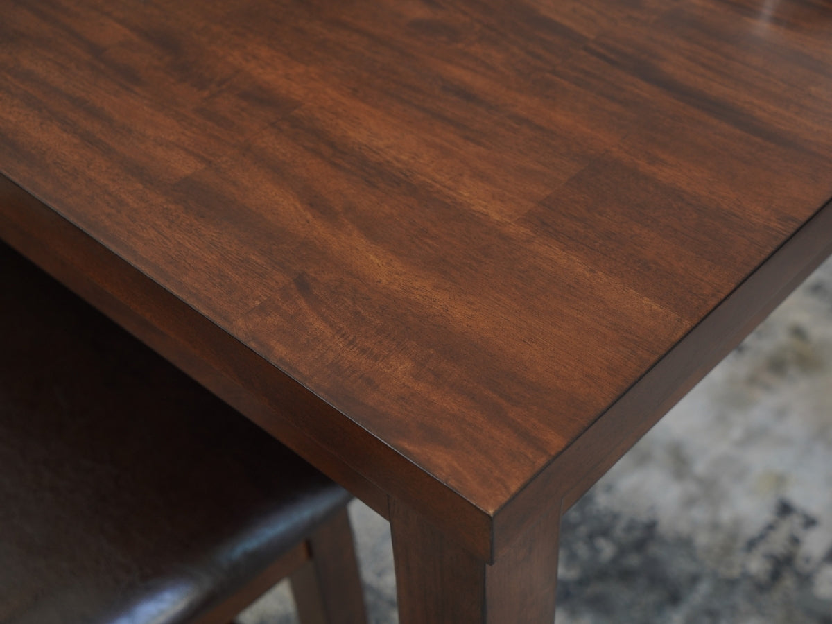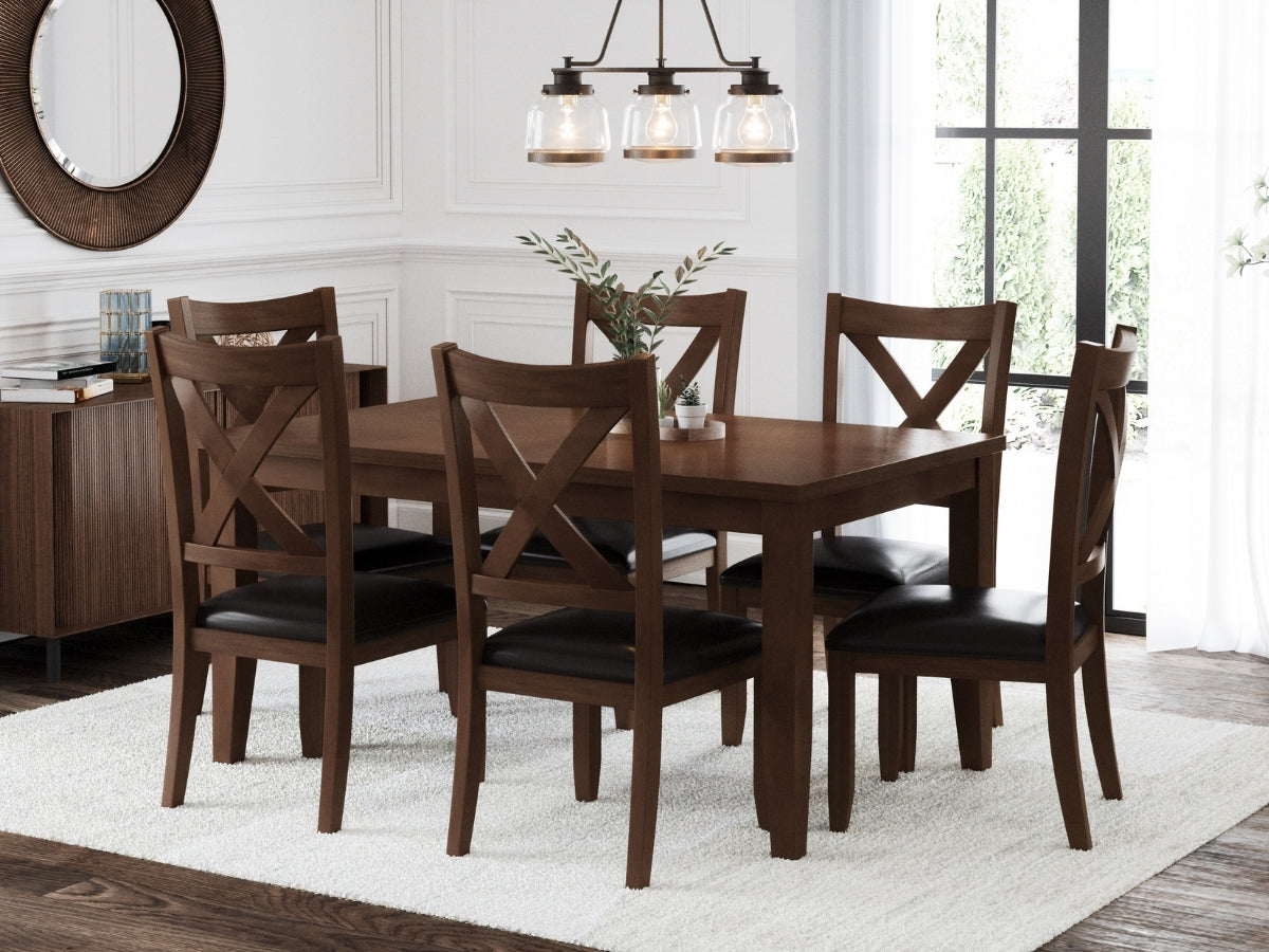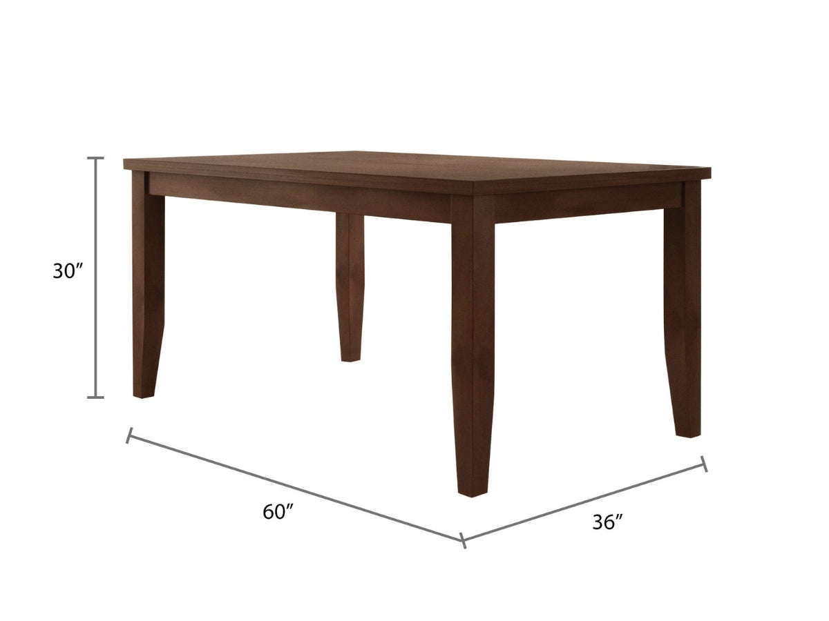 Includes: One (1) dining table Materials: Wood Color: Dark brown Style: Contemporary Espresso finish Tapered legs Seats up to six (6) Assembly Required