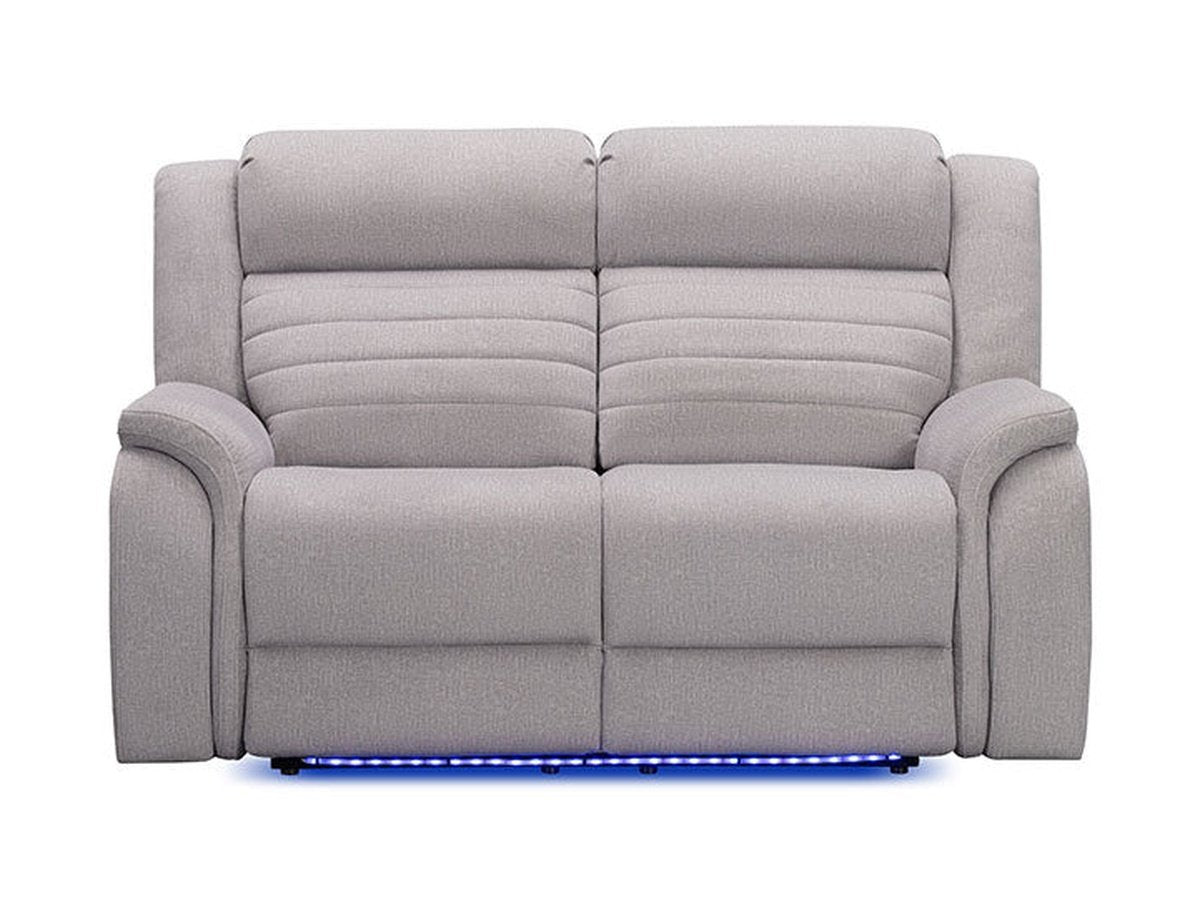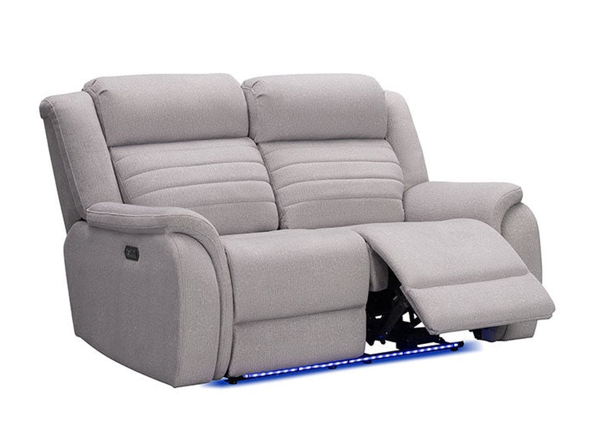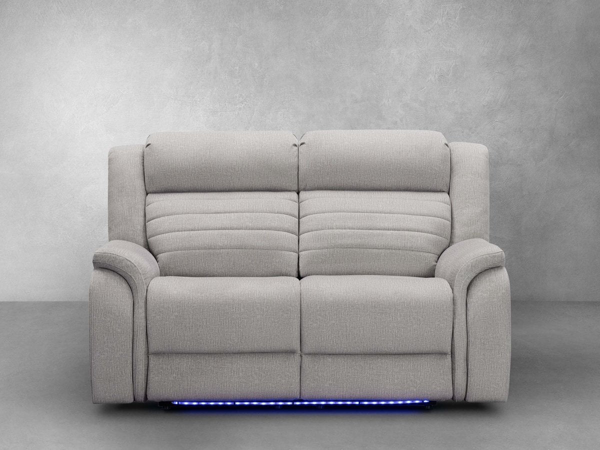 Elevate a transitional living room into a restful retreat with the Tristan Power Reclining Loveseat with Heat and Massage. Perfect for entertainment rooms and movie-watching experiences, this loveseat boasts a built-in blue light that illuminates from beneath the base, creating visibility and soothing ambience. Under the padded armrests and dense foam cushions is a heating and massaging mechanism, elevating the relaxation. A gray tone polyester fabric offers a soft and smooth surface to rest, as well as a neutral color palette for existing decor. Complete your living room with the Tristan Reclining Chair and Reclining Sofa.